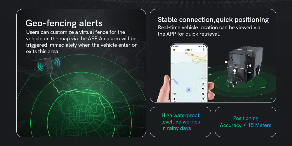 1. 遠程開關鎖:無需親自接觸車輛,通過手機APP即可實現車鎖的開關,極大提高了使用的便利性 2. 電子圍欄:用戶可以通過APP在地圖上為車輛定制一個虛擬圍欄,當車輛超出或者進入該區域時,會立即向平臺發出警報 3. 提高配送效率?:通過精確的路徑規劃和車輛調度,實現24小時不間斷配送,減少交通擁堵,提高配送效率。? 4. 實時監控與數據分析?:提供實時監控和數據分析功能,優化車輛調度,提升管理效率,減少管理成本